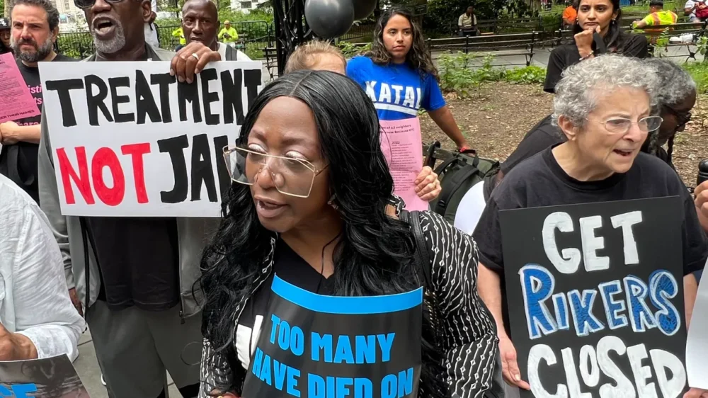 Mientras autoridades carcelarias insisten en que las cosas van por buen camino en la problemática cárcel, manifestantes se plantaron al lado de la sede de la Alcaldía de Nueva York…