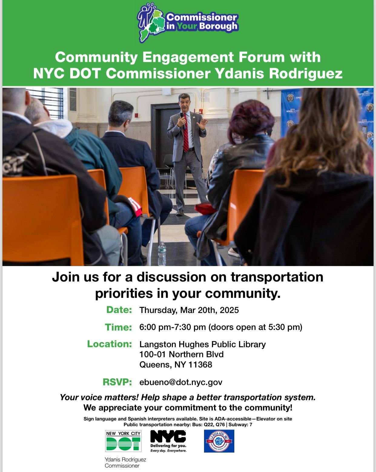 NUEVA YORK.- El comisionado del Departamento de Transporte de NY (NYC DOT), Ydanis Rodríguez, se reunirá este jueves 20 de marzo con más de 20 organizaciones comunitarias de Queens para…