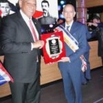 3) El cónsul en Nueva York, Jesús Vásquez Martínez, entrega una placa de reconocimiento a Adalberto Domingue por su trayectoria de 55 años ejerciendo el periodismo y su patriotismo en los ideales de Juan Pablo Duarte.