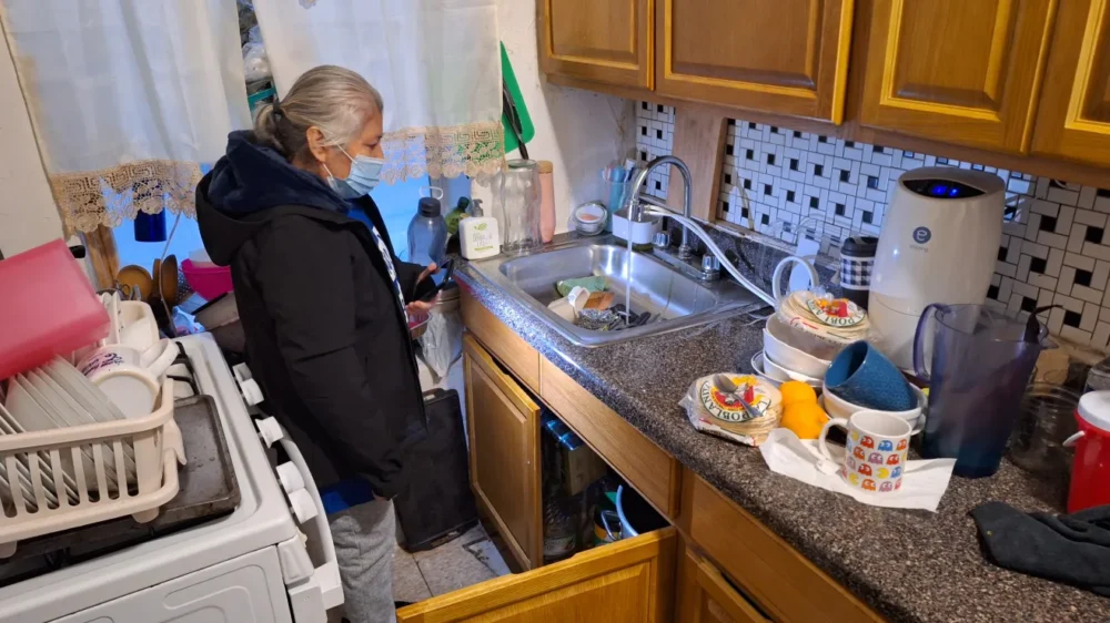 La poblana Luisa Aragón también vive en ese edificio. Además de los problemas de moho y roedores, le ha sido imposible que le resuelvan las filtraciones de su lavadero de platos, en donde ha tenido que disponer varios recipientes para poder contener el agua.