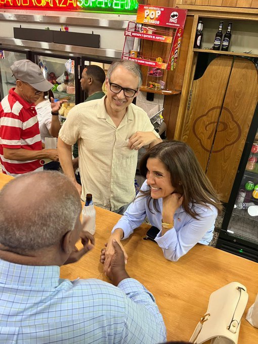 “¡Hoy es viernes y el cuerpo lo sabe! Qué mejor manera de que nuestra embajadora Leah F. Campos disfrute un buen tiempo en modo dominicano, en un colmado, disfrutando la música y el buen ambiente, junto con Ali Nadir, consejero político de la Embajada de los Estados Unidos y el equipo de la sección política – para disfrutar de un espacio representativo de la cultura  dominicana. ¡Gracias Dominicana por mostrar lo mejor de su gente!”, su mensaje en su cuenta x  @EmbajadaUSAenRD