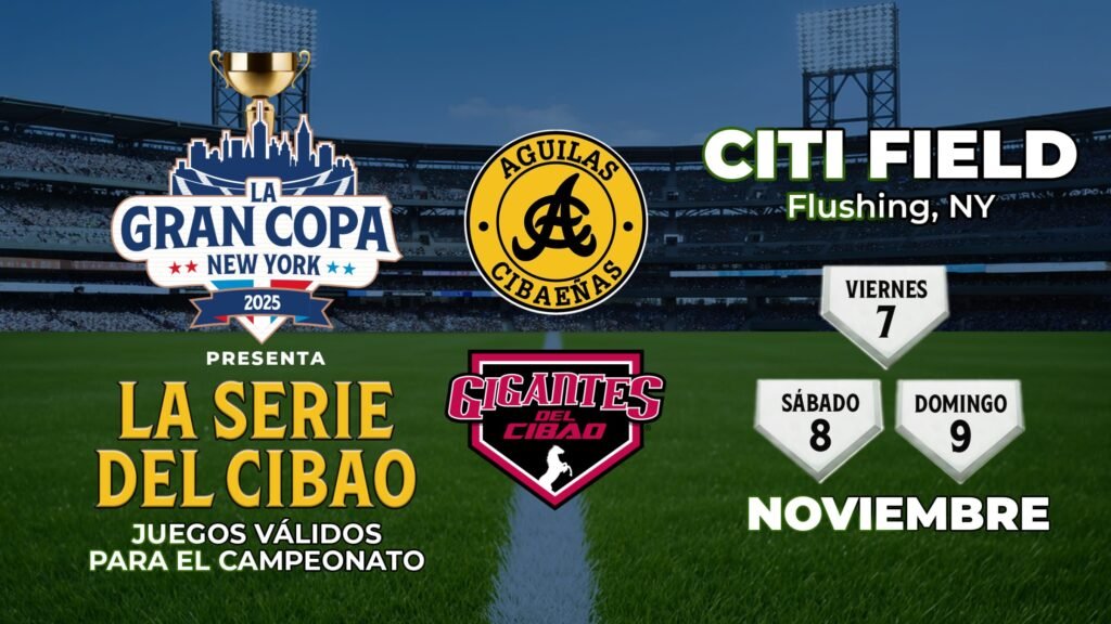 Nueva York. – La emoción del béisbol dominicano se traslada al corazón de la Gran Manzana con La Serie del Cibao, un evento histórico que reunirá a las Águilas Cibaeñas y los Gigantes del Cibao en el Citi Field, los días 7, 8 y 9 de noviembre de 2025. Más que una serie deportiva, esta celebración representa un acontecimiento de unidad, orgullo y proyección cultural para la diáspora dominicana en Estados Unidos.