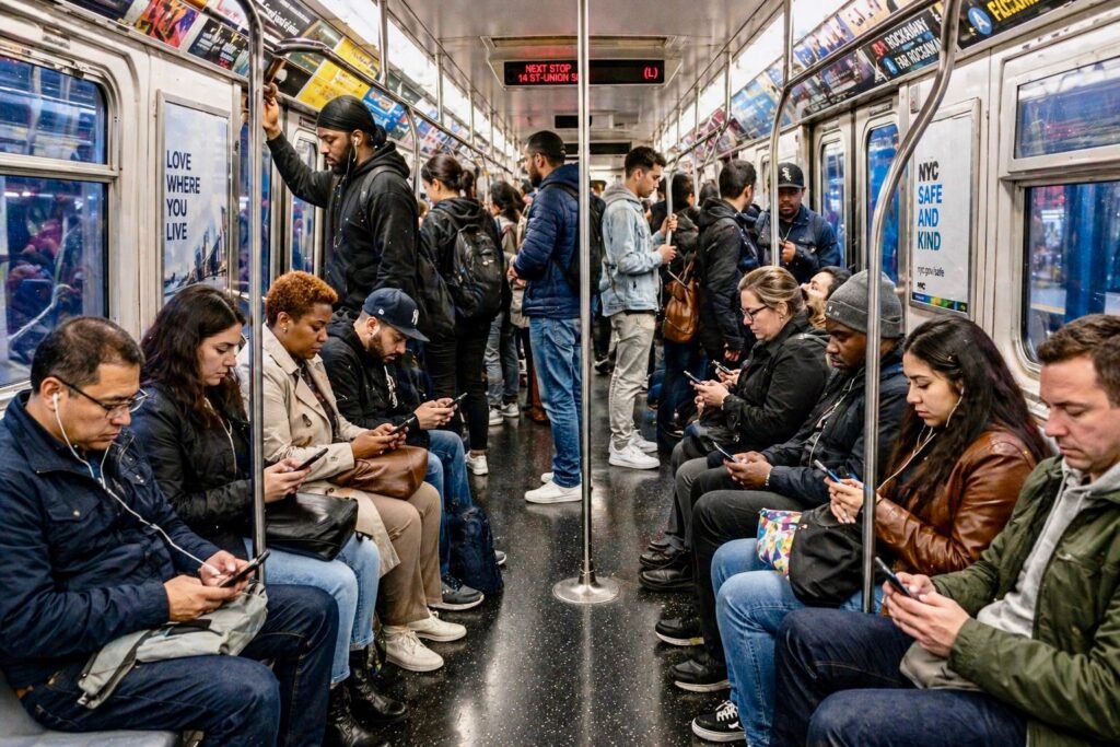 ¿Falta de conexión o inteligencia social? Aunque parezca lo contrario, el subway no es un lugar frío… es un lugar regulado por códigos invisibles. Ese silencio colectivo puede interpretarse como un pacto urbano: “No te invado, tú no me invades.”