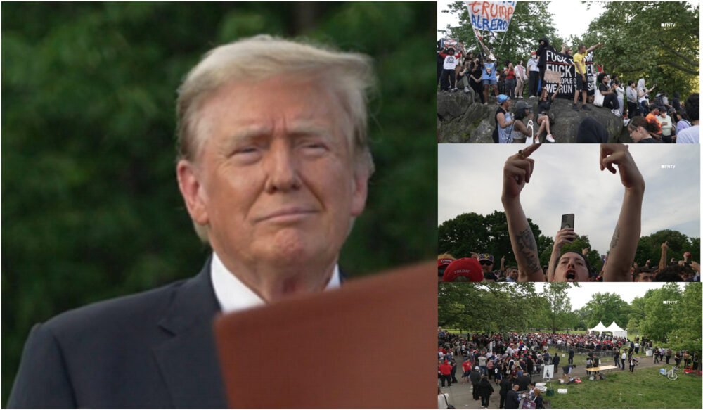 NUEVA YORK._ El ex presidente de Estados Unidos, habla en el mitin en el parque Crotona Park en El Bronx la noche de ayer jueves mientras era rechazado por sus oponentes. (Imágenes FNTV).
