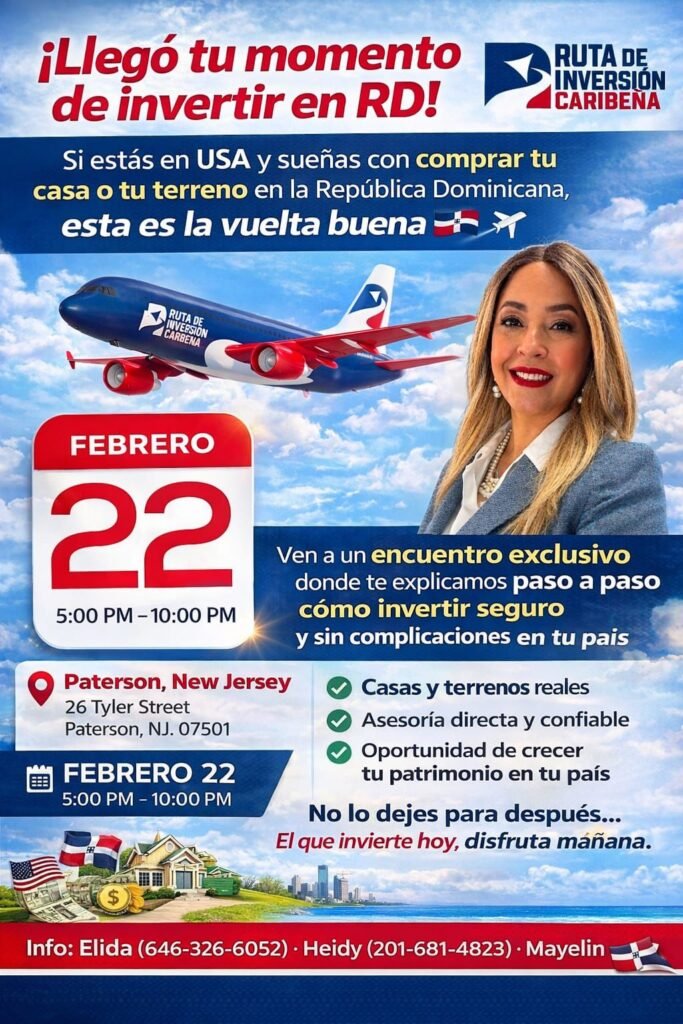 Paterson, NJ — La oportunidad que muchos dominicanos en Estados Unidos han estado esperando finalmente llega a New Jersey. La Ruta de Inversión Caribeña celebrará un encuentro exclusivo el próximo 22 de febrero, de 5:00 PM a 10:00 PM, en el 26 Tyler Street, Paterson, NJ 07501, con el objetivo de orientar paso a paso a quienes desean invertir de manera segura en la República Dominicana. La invitación está abierta al público interesado. La entrada es gratuita, pero el cupo es limitado.
