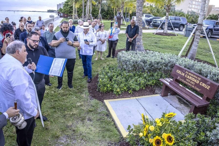 Unas 50 personas, entre ellas un primo, un sobrino y otros familiares de la artista, asistieron a la inauguración y bendición de un banco con el nombre de Celia Cruz grabado situado en el malecón que se encuentra junto a la ermita de Nuestra Señora de la Caridad del Cobre y mira hacia Cuba.
