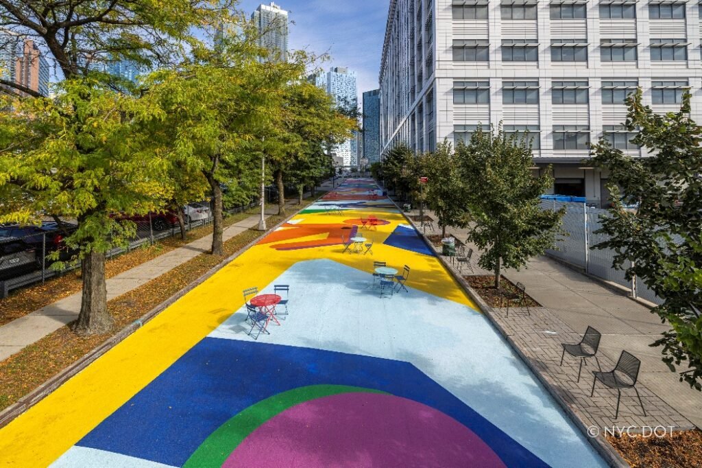 La nueva plaza transforma de 17,000 pies cuadrados de vía en un animado centro comunitario con asientos, programación y uno de los murales de asfalto más grandes de la ciudad de Nueva York.