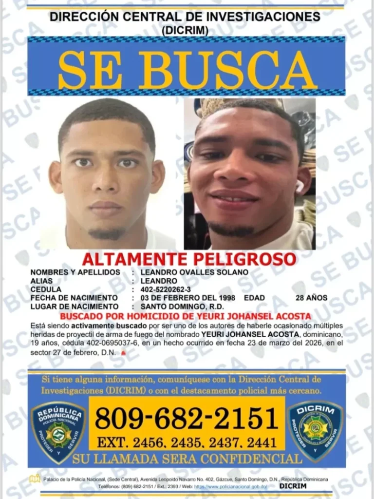 El homicidio de Yeuri Johansel Acosta, un joven de 19 años, ha conmocionado al sector 27 de Febrero en el Distrito Nacional, donde fue asesinado a tiros en la madrugada del 23 de marzo de 2026. Las autoridades han identificado a tres presuntos responsables —Leandro Ovalles Solano (28 años), Ademil Reyes Montero (23 años) y un individuo conocido como «Li» o «Compañero»— quienes son buscados activamente para responder por este crimen, vinculado a «conflictos interdelincuenciales». La muerte de Yeuri ha generado indignación en la comunidad, que exige justicia y medidas para frenar la violencia en la zona.
